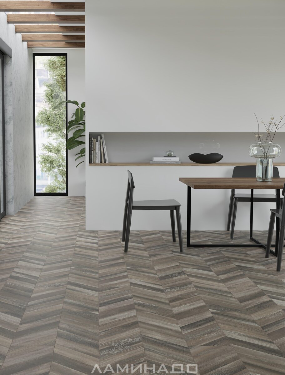 Данный декор ламината имеет фрезерованную V-образную фаску, которая расположена по краям доски с 4-х сторон, что четко очерчивает границы панелей. Реалистично имитирует пол из натуральной доски. Площадь помещения визуально увеличивается. Создает стильный интерьер.