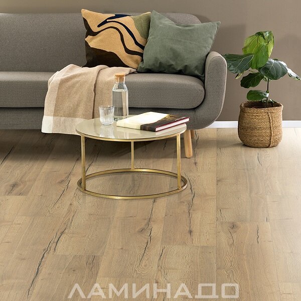 Данный декор ламината имеет фрезерованную V-образную фаску, которая расположена по краям доски с 4-х сторон, что четко очерчивает границы панелей. Реалистично имитирует пол из натуральной доски. Площадь помещения визуально увеличивается. Создает стильный интерьер.