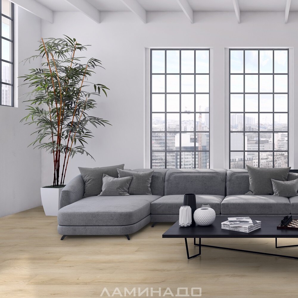 Данный декор ламината имеет фрезерованную V-образную фаску, которая расположена по краям доски с 4-х сторон, что четко очерчивает границы панелей. Реалистично имитирует пол из натуральной доски. Площадь помещения визуально увеличивается. Создает стильный интерьер.